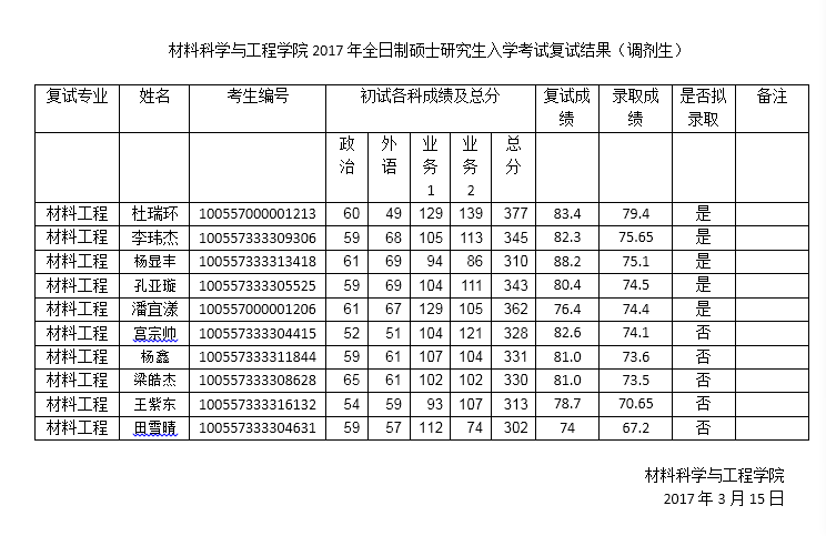 betway西汉姆联官网2017年全日制硕士研究生入学考试复试结果(调剂生)