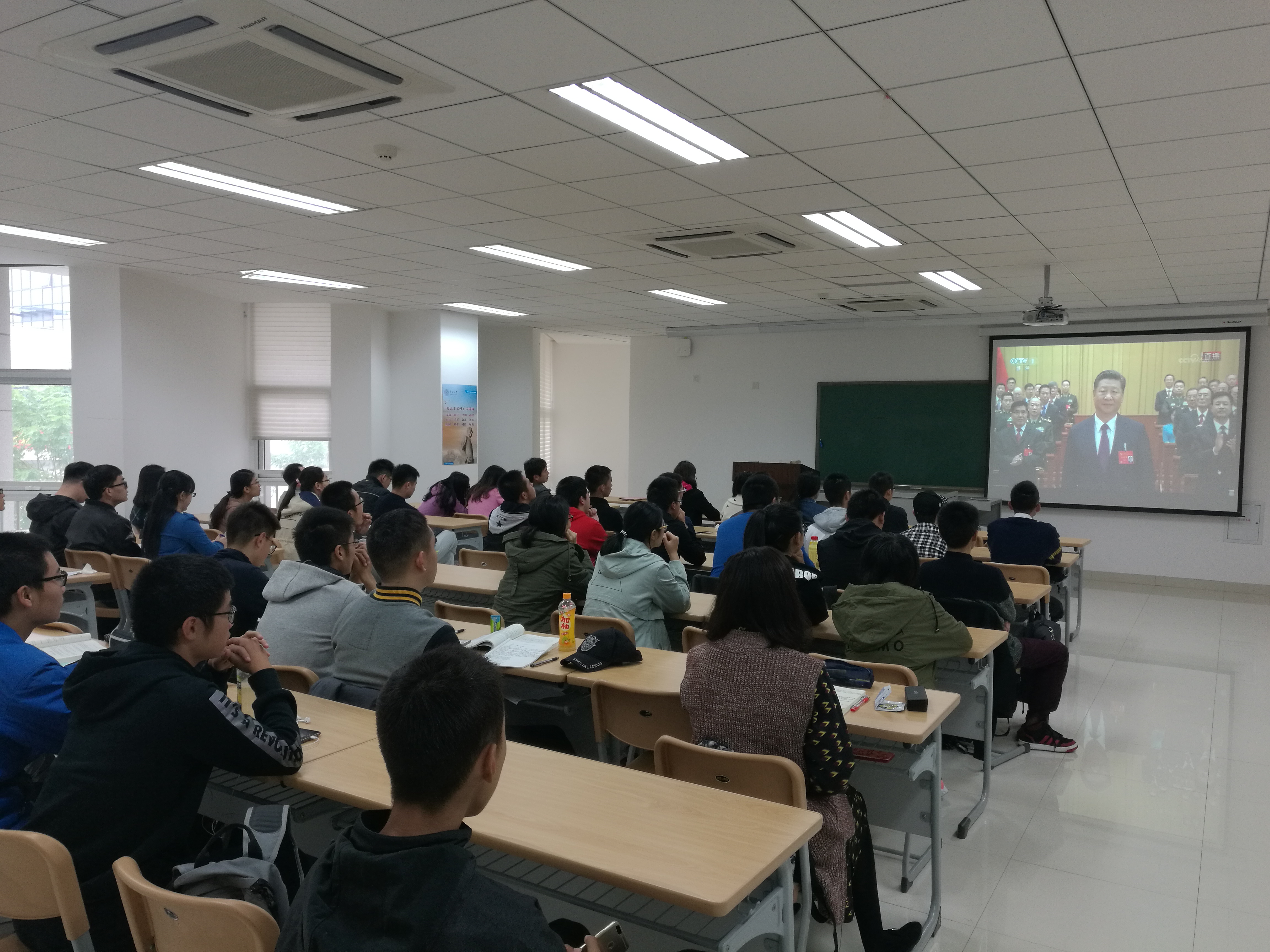 在231教室,院团委组织全院员工集中观看开幕式,通过组织观看十九大开幕会的形式,教育和引导员工党员及广老员工全面准确地理解党的路线、方针和政策,深刻领会十九大精神,激发青年员工的奋斗热情和社会责任感。学院辅导员贾盛老师表示,党的十九大是在全面建成小康社会决胜阶段、中国特色社会主义进入新时代的关键时期召开的一次十分重要的大会。十八大以来的五年,是党和国家发展进程中极不平凡的五年。开幕会上习近平总书记作出中国特色社会主义进入新时代的新论断,指出我国社会主要矛盾已经转化为人民日益增长的美好生活需要和不平衡不充分的发展之间的矛盾,为党和国家接下来的五年指明了方向。实现伟大梦想,进行伟大斗争,建设伟大工程,推进伟大事业,呼唤伟大思想。以党的十九大胜利召开为标志,形成的新时代中国特色社会主义思想,是马克思主义中国化最新成果,是党和人民实践经验和集体智慧的结晶,是中国特色社会主义理论体系的重要组成部分,是全党全国人民为实现中华民族伟大复兴而奋斗的行动指南。