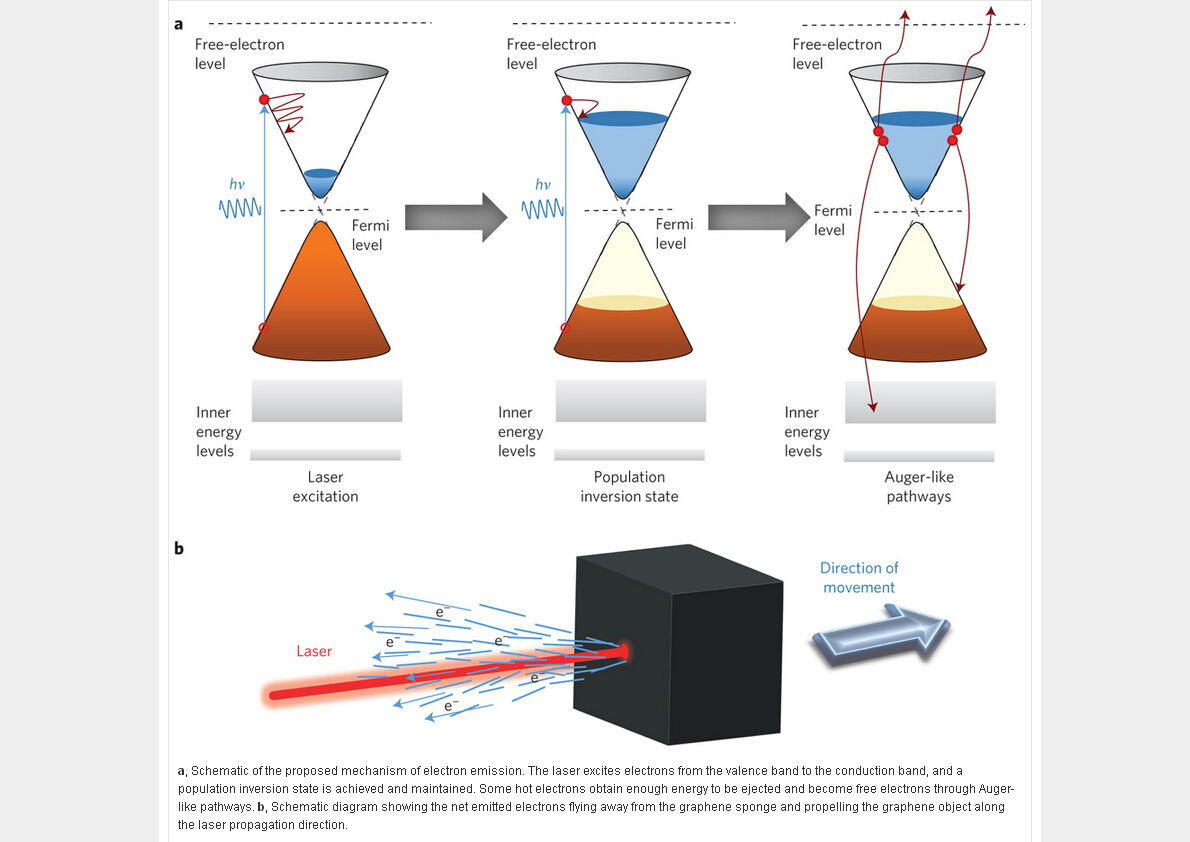 除了观察到这种光直接驱动飞行外,研究团队经过大量的实验,提出了一种新的驱动机理,即这种材料在光作用下,通过发射大量的电子获得了相应的驱动力,即这种特殊的驱动是通过电子喷射获得的,完全不同于传统的化学火箭。目前陈永胜教授团队正在对这种这种机理的进行进一步的研究和验证。因此本材料还可以作为一种方便的电子发射源。该工作同时认为,其它具有类似Dirac能带的结构的材料,通过合适的组装也可能获得类似的性质和性能。