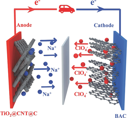 Na-ion capacitors have attracted extensive interest due to the combination of the merits of high energy density of batteries and high power density as well as long cycle life of capacitors. Here, a novel Na-ion capacitor, utilizing TiO2@CNT@C nanorods as an intercalation-type anode and biomass-derived carbon with high surface area as an ion adsorption cathode in an organic electrolyte, is reported. The advanced architecture of TiO2@CNT@C nanorods, prepared by electrospinning method, demonstrates excellent cyclic stability and outstanding rate capability in half cells. The contribution of extrinsic pseudocapacitance affects the rate capability to a large extent, which is identified by kinetics analysis. A key finding is that ion/electron transfer dynamics of TiO2@CNT@C could be effectively enhanced due to the addition of multiwalled carbon nanotubes. Also, the biomass-derived carbon with high surface area displays high specific capacity and excellent rate capability. Owing to the merits of structures and excellent performances of both anode and cathode materials, the assembled Na-ion capacitors provide an exceptionally high energy density (81.2 W h kg−1) and high power density (12 400 W kg−1) within 1.0–4.0 V. Meanwhile, the Na-ion capacitors achieve 85.3% capacity retention after 5000 cycles tested at 1 A g−1.