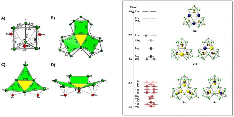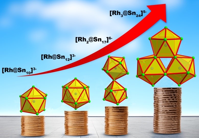 课题组近期在贵金属掺杂的十四族全金属团簇合成上也取得突破,采用模板剂诱导合成方法,逐步组装合成了系列不同尺寸的内嵌Rh原子的的全金属Sn簇,包括单金属内嵌[Rh@Sn10]3−和[Rh@Sn12]3−,双金属内嵌[Rh2@Sn17]6−,及首例三金属内嵌十四族簇[Rh3@Sn24]5–。[Rh3@Sn24]5–团簇是已知目前从溶液中分离得到的最大的内嵌型十四族金属团簇,其三重融合的拓扑结构与β-菱形硼中B28簇的拓扑结构非常相似。该系列结构密切相关Rh/Sn簇可在同一个反应中控制不同反应条件分离,为研究十四族金属团簇生长机理提供了实验支撑。电喷雾电离质谱研究表明溶液中存在几个不饱和的、较小的团簇片段可能在团簇生长成核过程中起重要作用。课题组与牛津大学McGrady教授合作,采用密度泛函理论分析了团簇的电子结构,结果表明内嵌Rh原子4d轨道与锡笼价键轨道相互作用诱导这些结构变化。[Rh3@Sn24]5–簇中的Rh中心具有闭壳d10构型(-1价),并且包封的[Sn24]2-笼具有显著三维芳香性特征,两者共同作用使得[Rh3@Sn24]5–团簇能稳定存在。该工作发表在最新一期的Chem. Sci.上,并被选为封面论文(Chem. Sci., 2019,10, 4394-4401)。