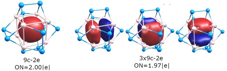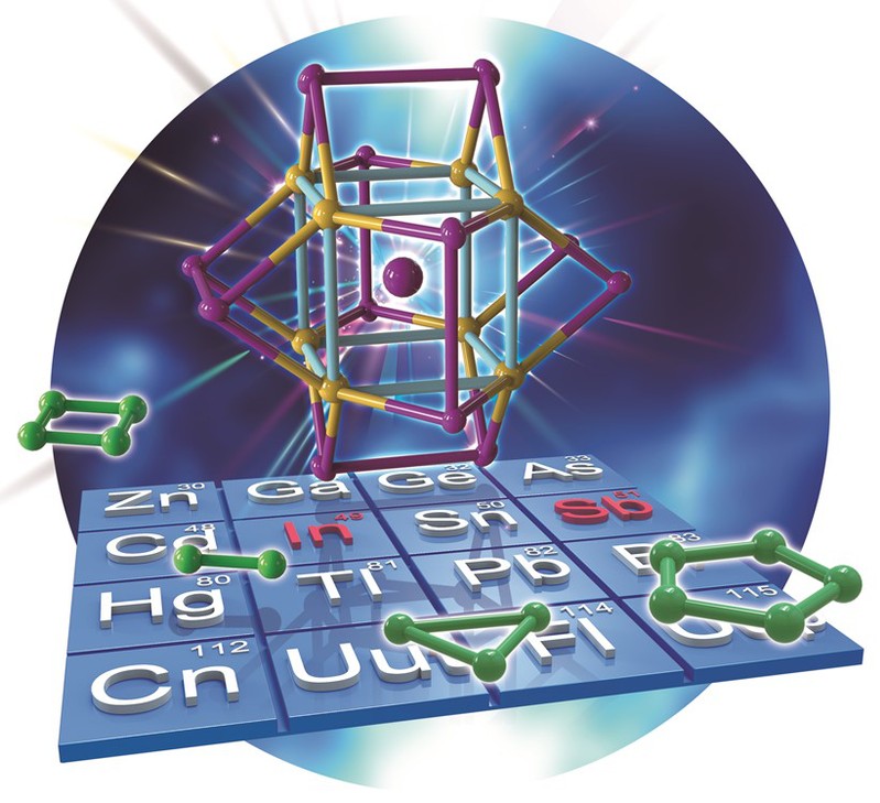 近日,课题组成功制备了一例具有Th对称性的全金属团簇[Sb@In8Sb12]3-, Angew. Chem. Int. Ed.(DOI: 10.1002/anie.201904109)。该团簇结构是单个Sb原子内嵌在一个五角十二面体的In8Sb12笼中,八个In位点向内凹陷直接与Sb成键,是固相中首例具有Th对称性的全金属团簇。单晶结构辅以理论计算表明,高度对称的[Sb@In8Sb12]3-与其两电子还原化合物[Sb@In8Sb12]5-以1:1比例共存,后者两个毗邻的In位点往外突出到与三个Sb共平面位置,同时也使得团簇整体以“[Sb@In8Sb12]4-”平均形式出现。AdNDP成键分析表明Sb@In8立方笼内存在着4个9c-2e的全离域键,8个离域电子满足2(N+1)2的球芳香性判据,体系中球芳香性对稳定团簇起着关键作用。