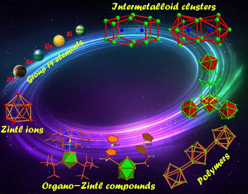 课题组近期在芳香性全金属团簇材料的合成及组装方面的研究也引起了一些国际期刊编辑的关注,孙老师应邀以《Recent Advances in Structural Chemistry of Group 14 Zintl Ions》、《Aromaticity and Antiaromaticity in Zintl Clusters》为题发表了两篇综述论文,详细地从合成方法、团簇结构类型、成键特征及规律等方面总结了全金属团簇的最新研究进展,探讨了金属芳香性在稳定全金属团簇中的作用机制,进一步展望了全金属团簇在材料物理及化学等方面的潜在应用(Coord. Chem. Rev. 2019, 382, 32-56,Chem. Eur. J. 2018, 24, 14583-14597)。