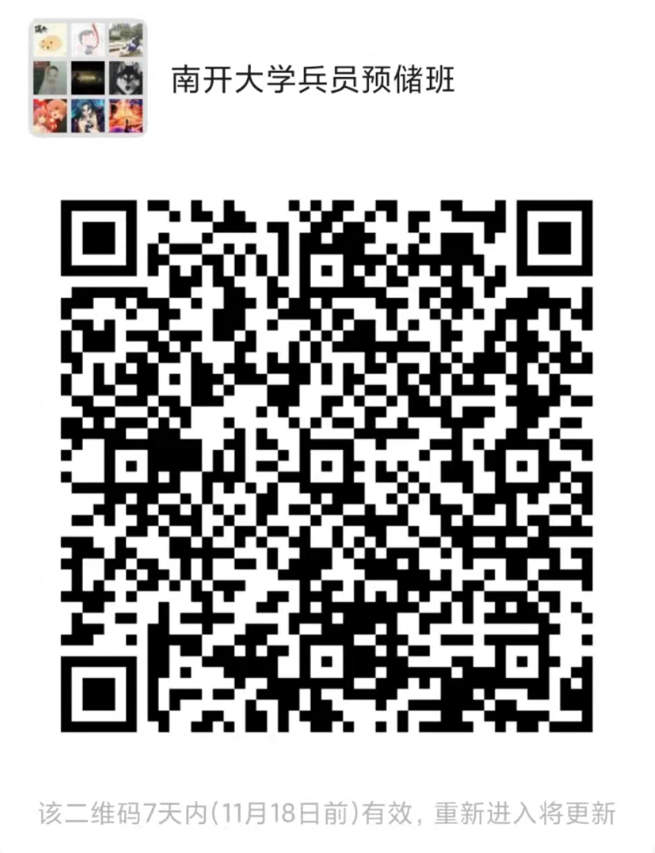 请各学院调研了解本学院员工参军入伍意愿,推荐组织符合条件的员工报名加入学校首期兵员预储班,有意向报名的兵员预储班的员工填写《betway西汉姆联官网首期兵员预储班员工报名登记表》(附件5),将登记表电子版与学院盖章的扫描版(或照片)于11月19日之前发送至人民武装部邮箱:rmwzb@nankai.edu.cn,已报名的员工扫码加入betway西汉姆联官网兵员预储班微信群(二维码见附件6)。