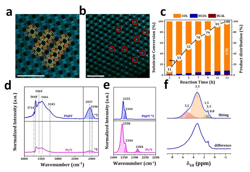 (a) 所制备的Pt@Y样品([110]方向);(b) Pt@Y样品的HAADF STEM照片;(c)Pt@Y样品的加氢活性;(d) Pt@Y和Pt/Y样品373K下H2活化原位FTIR谱图;(e) Pt@Y和Pt/Y样品173K下H2活化原位FTIR谱图;(f) H2吸附Pt@Y样品的1H MAS NMR谱图