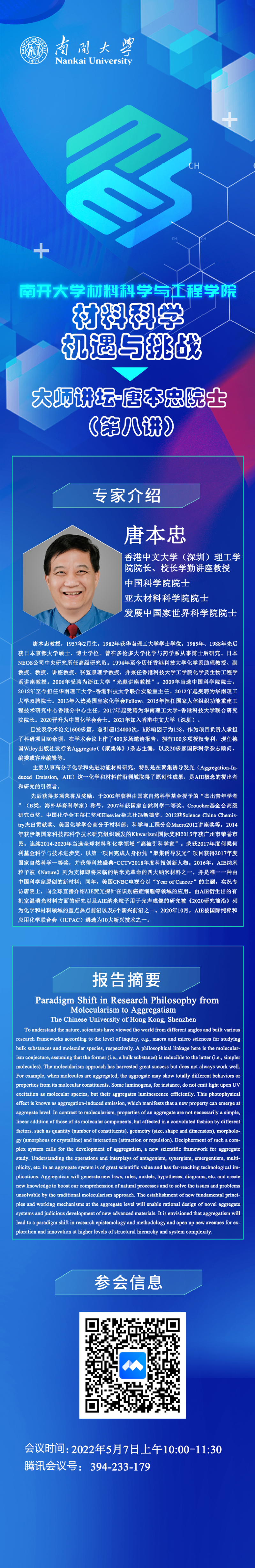 “材料科学机遇与挑战”大师讲坛丨唐本忠院士:Paradigm Shift in Research Philosophy from Molecularism to Aggregatism