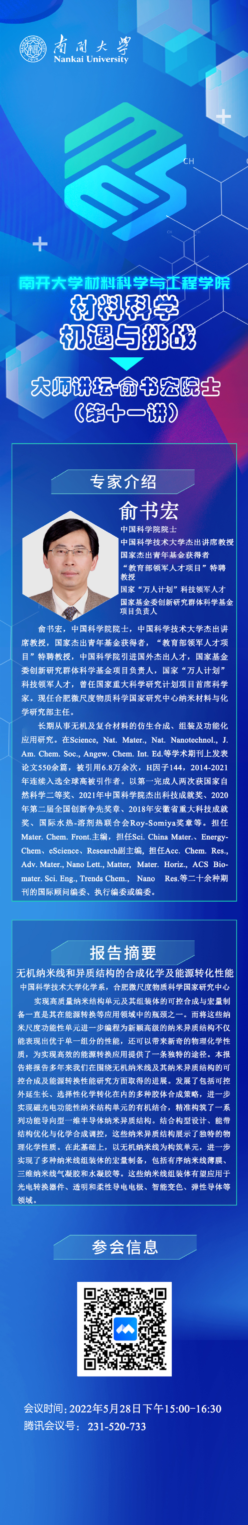 “材料科学机遇与挑战”大师讲坛丨俞书宏院士:无机纳米线和异质结构的合成化学及能源转化性能