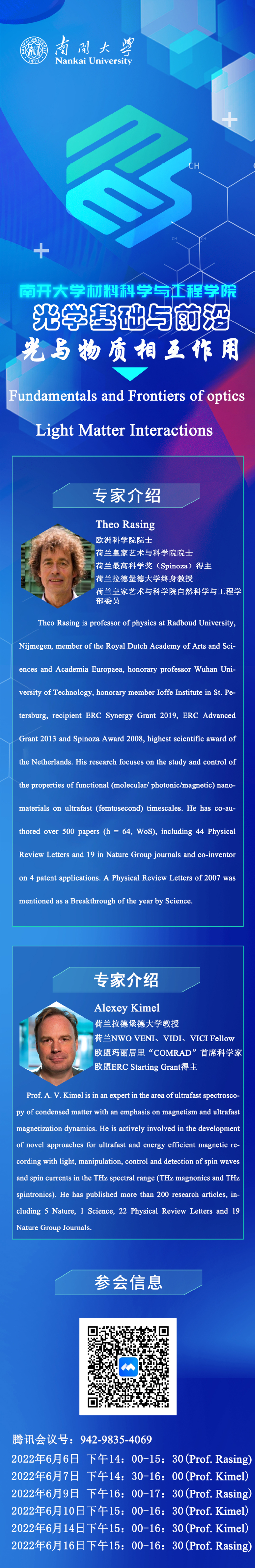 学术报告丨Prof. Theo Rasing & Prof. Alexey Kimel:Fundamentals and Frontiers of optics:Light Matter Interactions