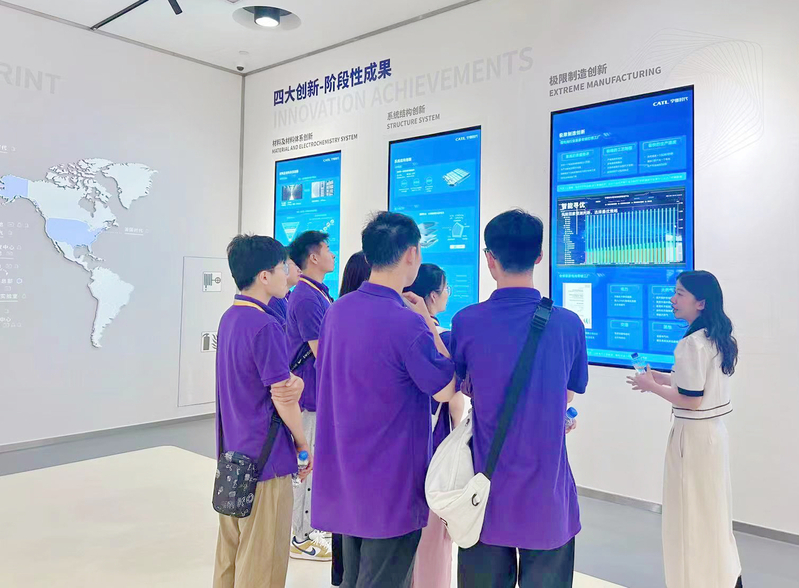 七月的闽东大地,骄阳似火,生机勃勃。实践队来到宁德时代新能源科技股份有限公司访企拓岗。宁德时代是全球领先的动力电池系统提供商,在新能源商用车电池系统市场份额连续六年全球第一,近年来每年从材料学院招聘多名优秀毕业生,是众多材料学子向往的“优秀雇主”。在公司校招经理的带领下,实践队认真参观了公司科技大楼主展厅,观摩了电池模型、检测视频以及储能设备,了解到公司迅速腾飞的历史。接下来,实践队来到制造工厂生产线实地考察,近距离观看了电芯的制造工艺流程,对我国科技发展水平叹为观止。