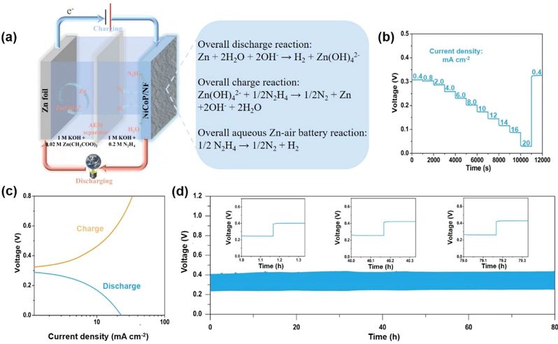 图4 Zn-Hz电池测试:Zn-Hz电池是一种肼辅助能量转换单元,在放电过程中通过HER产生氢,在充电过程中通过肼的电氧化产生氮。