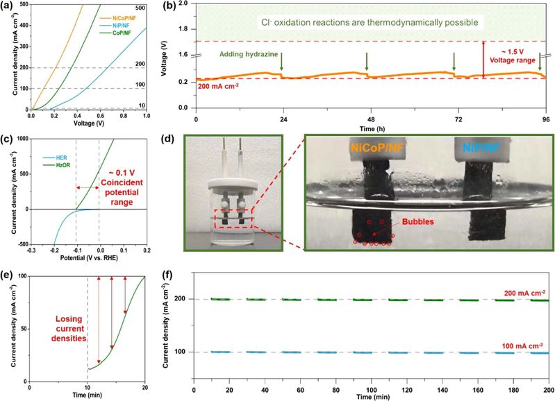 图3 性能测试:NiCoP/NF在HER和HzOR极化曲线之间存在约0.1 V的电位重合区,这个电位重合区表明HER和HzOR都可以自发地发生在NiCoP/NF的活性位点上,构成一个自激活/推进的水电解系统。