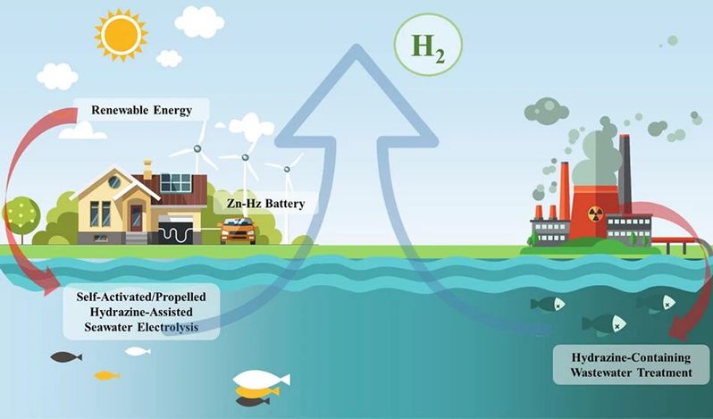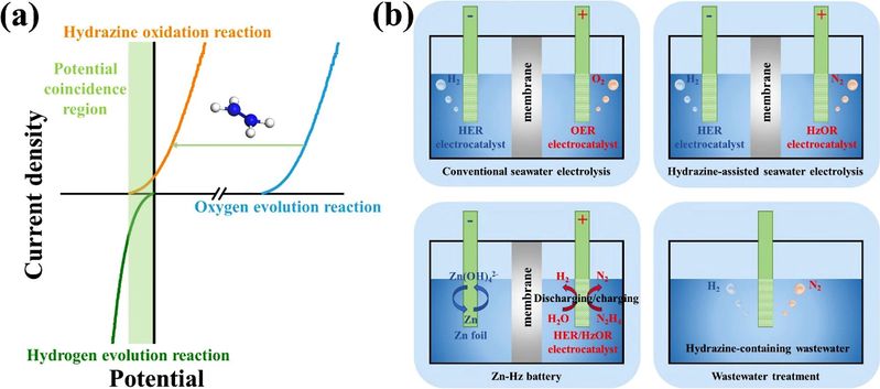 图2 (a)用HzOR代替OER的说明和电位重合区域的存在。(b)常规海水电解、肼辅助海水电解、锌-肼电池、含肼废水处理示意图。