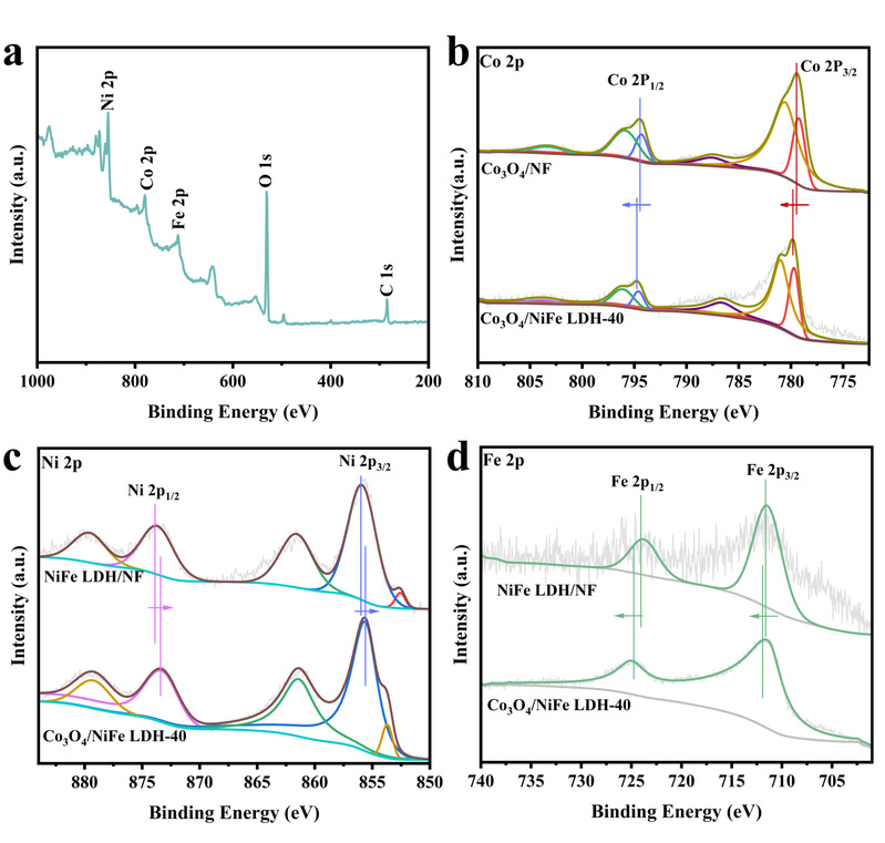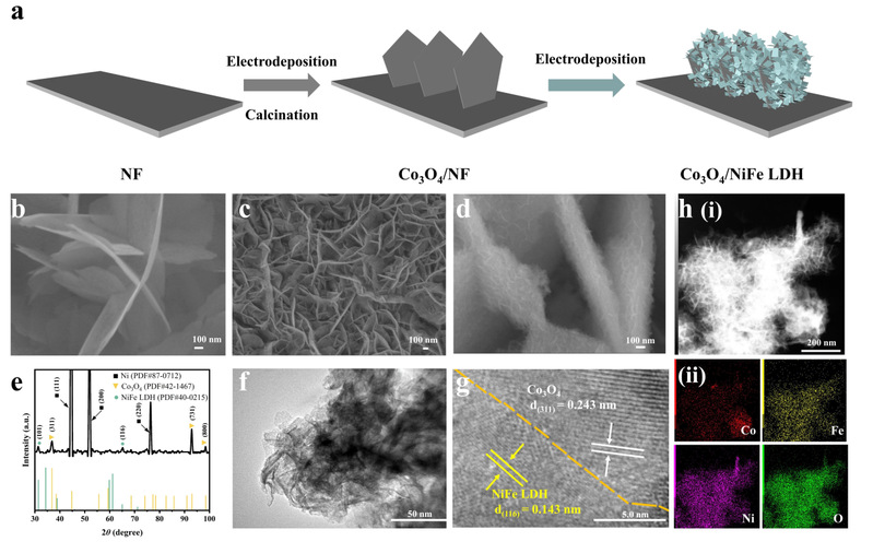 图1 (a) Co3O4/NiFe LDH 合成示意图。(b) Co3O4/NF,(c) NiFe LDH/NF ,(d) Co3O4/NiFe LDH-40 的 SEM 图像。(e) Co3O4/NiFe LDH-40 XRD 谱图。(f) Co3O4/NiFe LDH-40 的TEM 和 HRTEM 图像。(h) Co3O4/NiFe LDH-40 的 TEM 及相应元素映射图像。