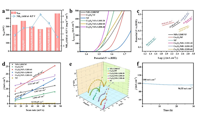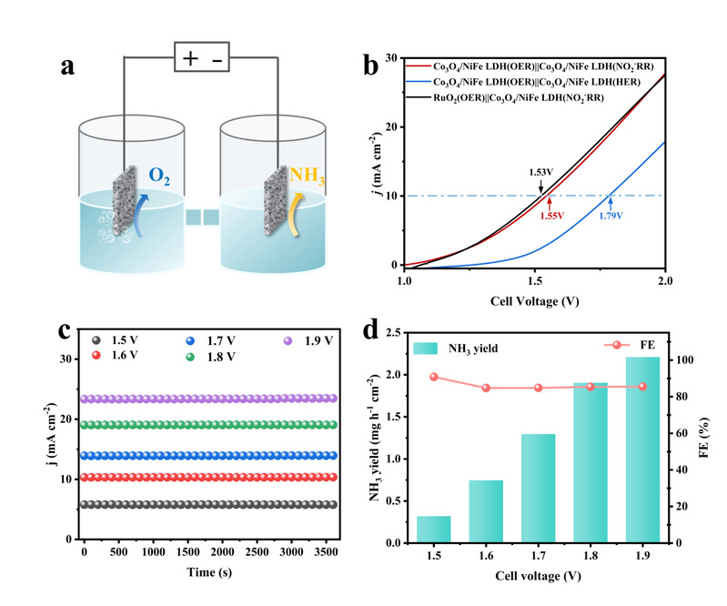 Co3O4/NiFe LDH 异质结构被开发作为 NO2−RR & OER 双功能电催化剂。得益于形成的异质结所优化的电子结构以及构建的核壳结所增加的电化学活性面积,Co3O4/NiFe LDH 具有高选择性和高活性 NO2−RR & OER 双功能性能。Co3O4/NiFe LDH 组装的双电极电解槽仅需 1.55 V 即可交付 10 mA cm−2 ,与先进的贵金属基催化剂组装电解槽的性能相当。这一努力不仅为通过调节界面电子相互作用来探索高效催化剂开辟了新的途径,而且为实现高效、低成本的电催化合成氨生产提供了新的见解。