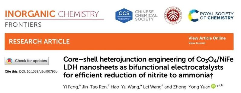 近日,betway西汉姆联官网袁忠勇课题组将高选择性的 Co3O4 和 OER 性能出色的 NiFe LDH 相结合,在镍泡沫表面原位生长了 Co3O4/NiFe LDH 核壳异质结构,该异质结构表现出优异的 NO2−RR 性能 (产率为 4.27 mg h−1 cm−2,在 −0.5 V 时 FE: 96.53%) 和不错的 OER 性能 (η100: 270 mV) 以及良好的稳定性。此外,Co3O4/NiFe LDH 异质结构组装的双电极电解槽仅需 1.55 V 即可达到 10 mA cm−2 ,接近贵金属基催化剂组装的制氨系统。良好的 NO2−RR & OER 性能得益于优化的电子结构和增加的电化学活性面积。这一努力为实现高效和低成本的电催化氨生产提供了新的见解。