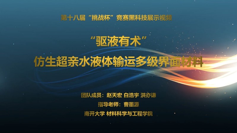 9月15日,第十八届“挑战杯”全国老员工学术科技作品竞赛“黑科技”展示活动落下帷幕。经过激烈角逐,由材料学院博士生赵天宏、白浩宇及本科生洪亦谦组成的团队凭借项目“驱液有术——仿生超亲水液体输运多级界面材料”脱颖而出,荣获“恒星级”作品(一等奖)。该团队在院团委的支持下,在公司曹墨源老师带领下,在全国大赛上展现出了南开材料人勇于创新、大胆实践、求真务实的优秀品格和良好的精神面貌。