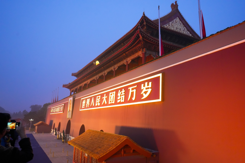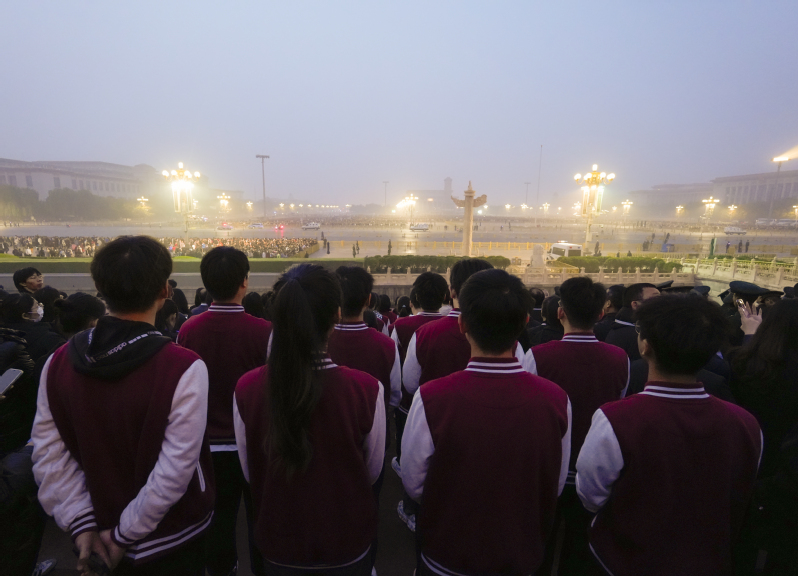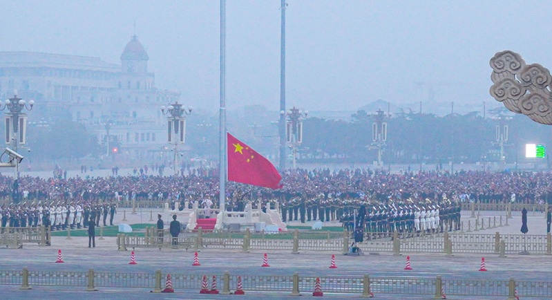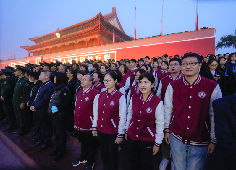 登上天安门城楼观礼台时,夜色渐消,曙光初现,师生们心潮澎湃、精神抖擞,难掩心中的自豪与激动,等待着五星红旗冉冉升起。伴随着日出东方,国旗护卫队员们迈着矫健铿锵的步伐,护卫着鲜艳的五星红旗入场。雄壮的国歌奏响,护旗手手把国旗,用力一挥,国旗缓缓升起,迎风飘展,同志们凝神静气,注目行礼,无不被这庄严肃穆的升旗仪式所震撼。