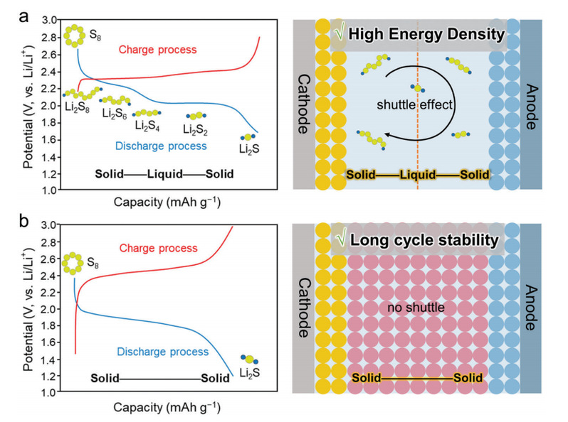 图1. 基于(a)“固-液-固”转换的Li-S电池电压分布,放电过程中有两个平台,S8在不同阶段通过Li2S8、Li2S6、Li2S4、Li2S2、Li2S转换,伴随着LiPSs的“穿梭效应”;(b)“固-固”转换,放电过程中只有单一平台,S8直接转换为Li2S,没有LiPSs的“穿梭效应”。 本 文 要 点