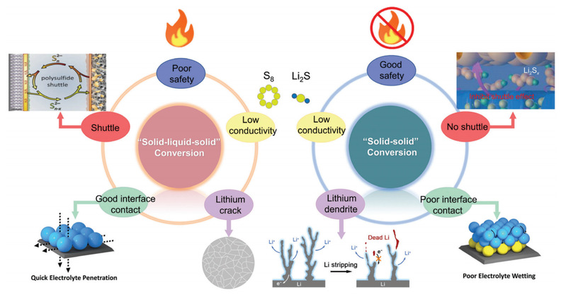 图2:基于“固-液-固”和“固-固”转换的Li–S电池的特点和挑战。