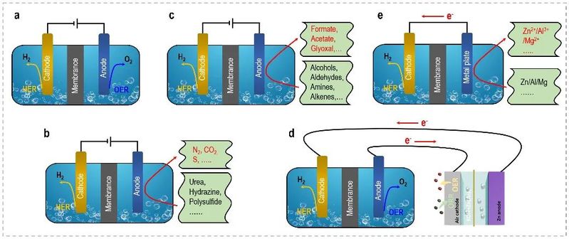 自催化H2生产是一种使用自产电力来驱动氢气生产的电催化过程,它避免了对外部电源的需求,使电解系统更加高效和可持续。在自催化氢气生产系统中,通常使用金属阳极通过阳极处的化学反应来获得自产电力。同时,这种自产电力可以流经外部电路,用于驱动阴极处的电催化反应,产生氢气。通过集成阳极和阴极处的电化学反应,自催化氢气生产系统允许同时进行H2生产和电力生成,使其更加高效和可持续。这种方法减少了对外部电源的依赖,使氢气生产过程更加节能。值得注意的是,已经探索了各种材料作为自催化电池的阳极材料,包括锌、铝和镁等金属,它们在放电过程中与水具有自发反应性,因此在放电过程中形成相应的金属氧化物。在充电过程中,电解液中的金属离子被还原回它们原来的金属电极,实现金属阳极的再生。然而,每种金属阳极在电化学反应、成本和稳定性方面都有其优点和限制。鉴于与大规模氢气部署相关的挑战,包括爆炸风险和高储存和运输成本,自供电的金属-H2O电池有望实现按需H2生成和能源供应。尽管自供能产氢系统可以通过自发的反应来减少电能的消耗,但它们通常需要大量的牺牲阳极金属,从而降低了整体经济效益。因此,迫切需要开发电催化系统,充分利用原子和电子,实现内部电源供应,同时最大程度地减少电极材料的浪费。为实现这些目标,提出了两种策略。(i) 组装可充电功能电池进行电极材料回收和高附加值化学品生产:通过设计具有功能性电极的可充电电池,电极材料可以得到有效回收,并用于生产高附加值的化学品。(ii) 在电池放电过程中将电极材料转化为高附加值化学品:与将电极材料视为消耗品不同,这种策略旨在在电池的放电过程中将它们转化为有价值的化学品。通过利用电池内部的电化学反应,电极材料可以经历受控的转化,从而产生高附加值的化学品。这种方法最大程度地利用了电极材料,减少了浪费,并提高了系统的整体效率。通过采用这些方法,研究人员可以将自催化系统推进到更可持续和高效的电化学过程。尽管杂化水裂解产氢体系取得了快速发展,但仍然面临一些挑战。首先,催化电极的制备仍然需要解决。催化电极集导电基底和电催化剂于一体,无需外来粘合剂,如果能够制备低成本、高产量、耐久、高活性、大尺寸、高比表面积、制备简单等多重特性的电极,将更受欢迎。其次,小分子氧化反应的机制仍然存在很大的争议。深入了解电催化和界面过程对于准确控制反应途径和所需产物的选择性具有巨大潜力。虽然已经成功降低了产氢的电耗,但起始原料、氧化产物分离与纯化等方面的成本仍然需要解决。另外,尽管碱性环境有助于阳极氧化的动力学和非贵金属电极的稳定性,但可能不适用于某些敏感的有机官能团,甚至某些有机氧化。考虑到有机分子的溶解度,反应介质不应仅局限于纯水,而应扩展至水/有机混合溶剂。此外,目前缺乏科学的、标准的技术经济分析。相关的经济性分析将有助于推动相关体系的工业化发展,以更好地理解其商业潜力。解决这些挑战将有助于促进杂化水裂解产氢技术的进一步发展和应用。