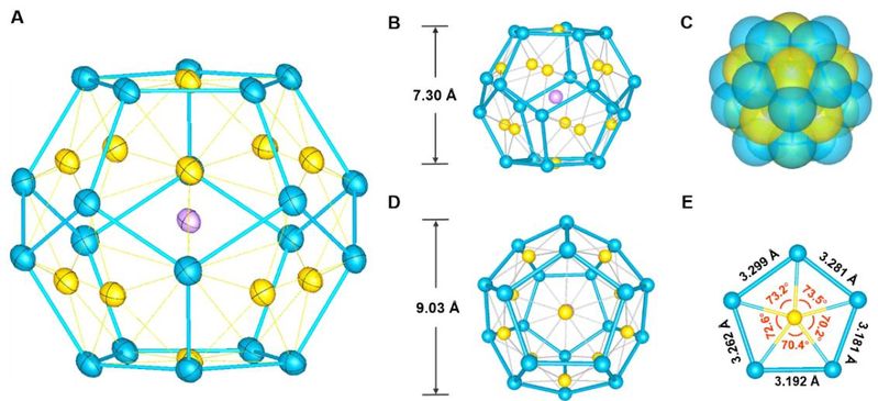 图1:全金属富勒烯[K@Au12Sb20]5-团簇结构示意图;钾原子为紫色,金原子黄色,锑原子为蓝色