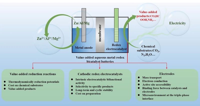 图2. 增值水系金属双催化剂电池的示意图以及相应考虑。