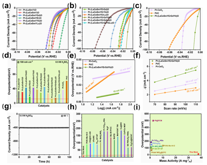 此外,催化剂的耐酸性能使其具有长期稳定性和优异的活性,Pt(LaCeSmYErGdYb)O在0.5 M H2SO4中成功地在400 mA cm-2@60°C下工作100 h,具有37.7 A mg-1Pt的高质量活性和38.2 s-1@12 mV的转化频率(TOF)值,远远优于最近报道的析氢反应(HER)催化剂。