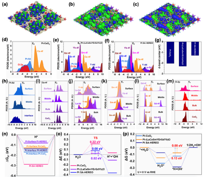密度泛函理论(DFT)计算表明,Pt和HEREO之间的相互作用优化了电子转移的电子结构和中间体的结合强度。HEREOs不仅促进了电子转移,而且还使Pt的d带中心下降,这进一步优化了质子结合和水解离,支持了在不同环境下高效稳定的HER性能。稀土元素的f轨道和d轨道构建了一个快速的电子转移途径,并固定了Pt的价态,以达到强大的电活性,降低了HER的能垒。