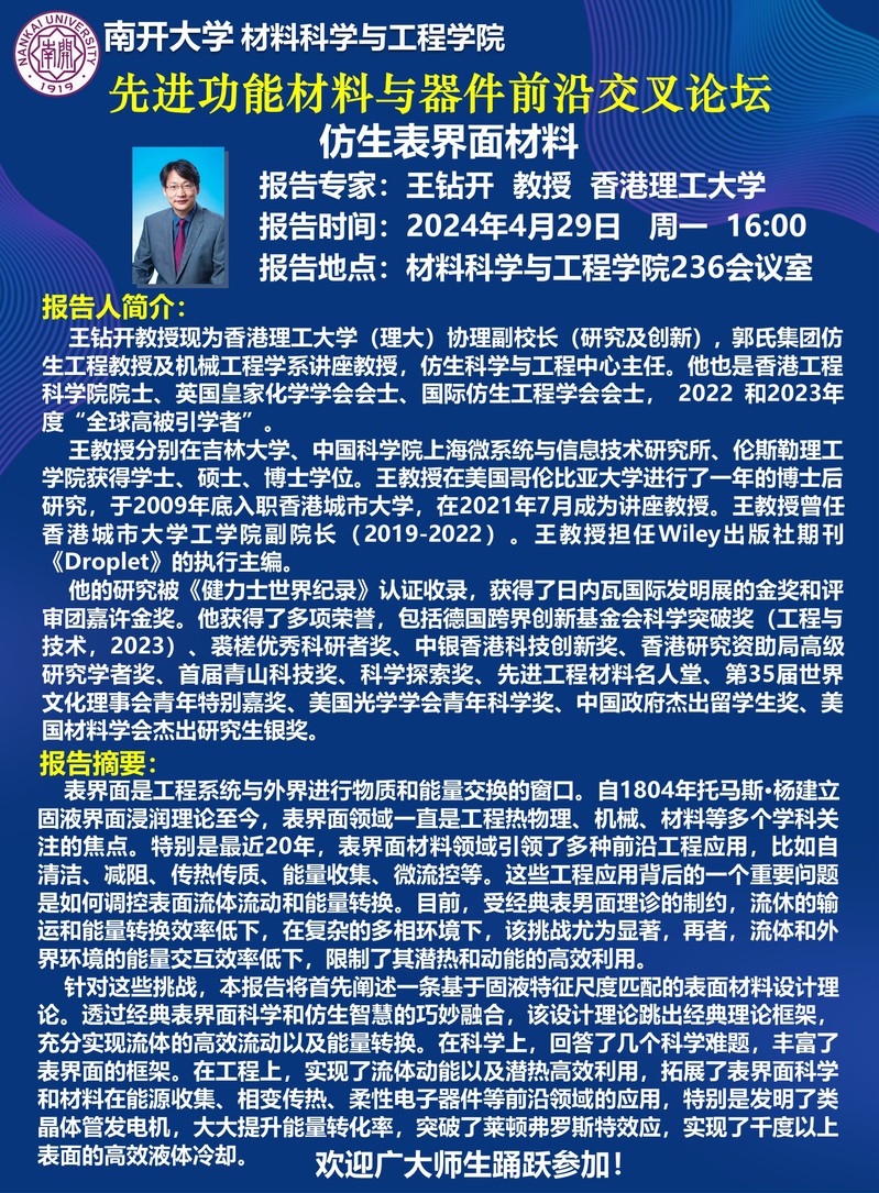 “先进功能材料与器件”前沿交叉论坛丨王钻开教授:仿生表界面材料