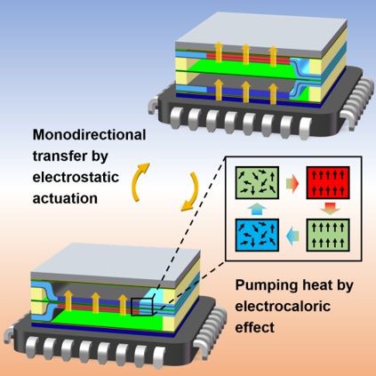 半导体芯片(CPU)等电子设备过热导致的故障率占比高达55 %,多项技术虽然被应用于制冷和散热,但是存在着高污染、高功耗、低集成化和无法精准制冷等诸多问题。为了解决上述问题,团队设计了一套基于电卡效应的近零碳排放的高效热管理材料与器件。像素矩阵制冷装置可以精准识别电子设备的过热部位,进而实现精准控温。该装置可以有效将CPU的表面温度降低33.2 K,并且全功率下运行的能耗仅为7.85 mW。相关成果已经发表在Advanced Materials和Advanced Energy Materials等期刊上。
