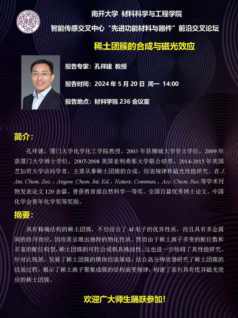 “先进功能材料与器件”前沿交叉论坛丨孔祥建教授:稀土团簇的合成与磁光效应