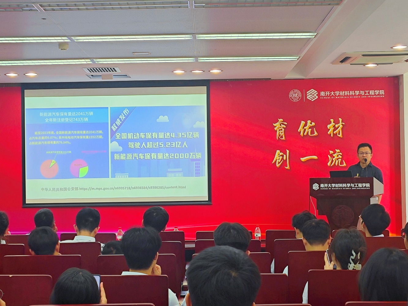 李国然教授对于新能源材料化学研究所进行了介绍,向同学们介绍了能源材料的发展前景、能材所的发展历程和研究方向、能材所的团队力量和招生方向等。