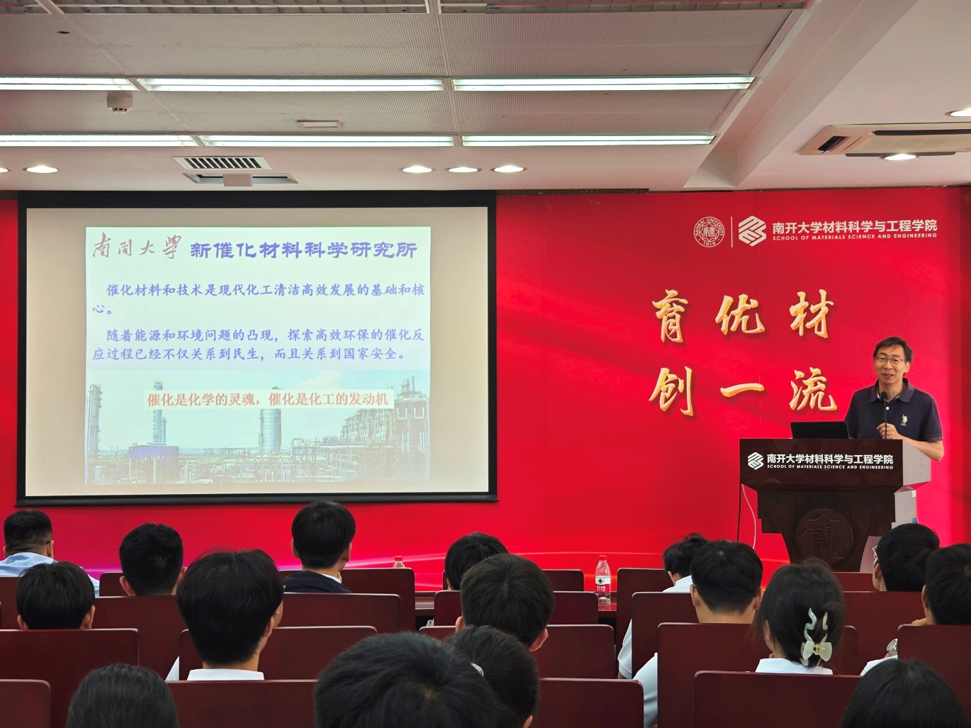 袁忠勇教授向同学们介绍了新催化材料科学研究所的相关内容,包括催化所的学科方向、主要研究方向和团队力量等。