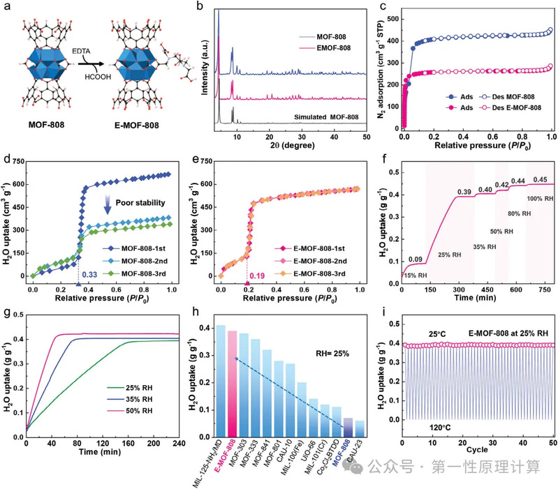 图1. E-MOF-808的合成与表征。(a)原始MOF-808合成E-MOF-808的过程示意图。(C,黑色球体;O,红色球体;N,天蓝色球体;H,粉色球体;Zr簇,蓝色多边形)。(b)MOF-808和E-MOF-808的PXRD谱图。(c)MOF-808和E-MOF-808的N2吸附-解吸等温线。(d)MOF-808和(e)E-MOF-808 3个循环的吸水等温线。(f)E-MOF-808的动态水蒸气吸附曲线。(g)不同RHs和25℃下的动态水吸附曲线。(h)在25%RH和25°C(298 K)条件下,E-MOF-808与其他代表性MOFs-808吸水量的比较。(i)在25% RH条件下,E-MOF-808吸附(25°C)-解吸(120°C)50次循环的循环稳定性。