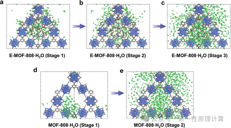 图2. E-MOF-808和MOF-808的水吸附过程GCMC模拟。E-MOF-808在(a)P/P0=0.05(第1阶段)、(b)P/P0=0.2(第2阶段)和(c)P/P0=0.35(第3阶段)时的模拟水吸附示意图。(d)P/P0=0.35(第1阶段)和(e)P/P0=0.55(第2阶段)时的模拟水吸附示意图。