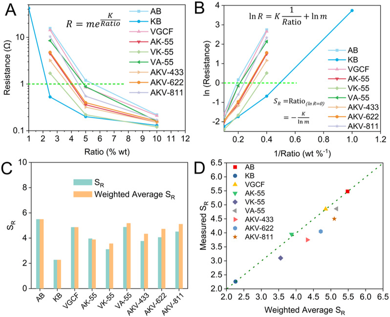 图3. 碳材料的比例灵敏度特性(A)电阻-比例响应曲线;(B) ln(电阻)-比例-1响应曲线;(C)碳材料的比例灵敏度(SR);(D)加权平均SR值与测量SR值对比图