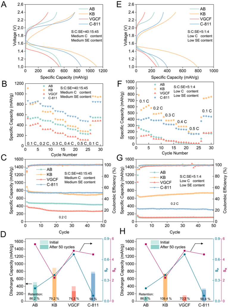 图6. 高硫含量正极的电池电化学性能;(A-D)ASSB-40% 和(E-H)ASSB-50% 的(A和E)首圈充放电曲线、(B和F)倍率性能、(C和G)循环性能和(D 和 H)容量-SP/SR关系图