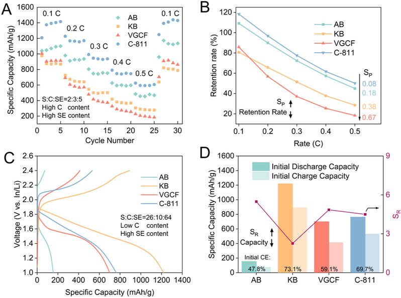 图4.不同碳/硫比正极的ASSB电化学性能;高碳/硫比正极ASSB的(A)倍率性能和(B)容量保持率;低碳/硫比正极ASSB在0.1 C下的(C)首圈充放电曲线和 (D) 比容量