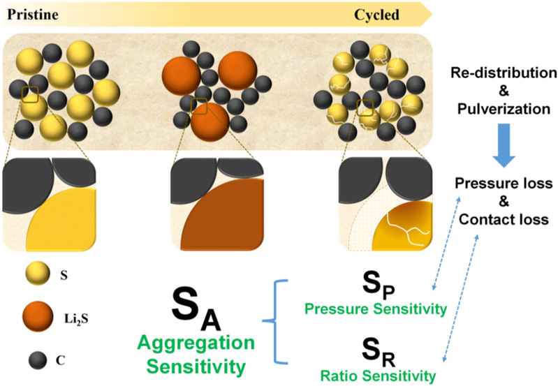 在ASSBs的制备过程中,通过高能球磨实现硫与导电碳材料的均匀混合,确保了硫-碳之间的良好接触和电子传输通道的形成。随后,正极复合材料经冷压成型,在高堆叠压力下保持接触。充放电过程中,硫与硫化锂的转化反应伴随体积变化和颗粒粉碎,导致内部出现局部压力波动和碳/硫比例变化。这些变化会导致导电网络结构的破坏,进而引起电导率下降和硫的利用率不足。直观来看,碳材料的形貌、尺寸、表面积、可压缩性以及石墨化程度等特性,都是影响其对压力和碳/硫比例灵敏度的关键因素。在ASSBs中,这种灵敏度可以作为设计碳载体和优化电池性能的有效指标,这启发作者提出了SA概念。