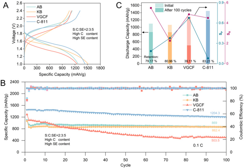 图5.低硫含量正极的电池电化学性能;ASSB-20%在0.1 C下的(A)首圈充放电曲线和(B)长循环性能;(C) 不同碳材料正极的电池容量-SP/SR关系图