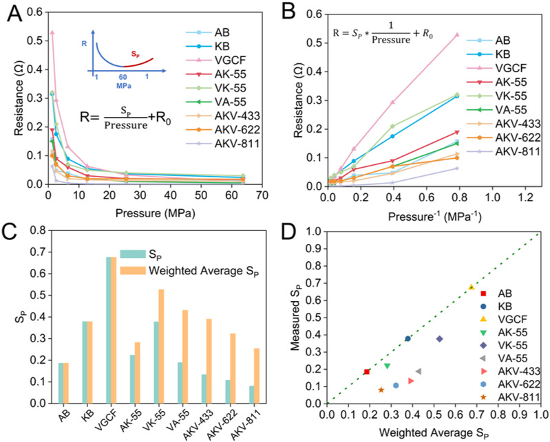 图2. 碳材料的压力灵敏度特性(A)电阻-压力响应曲线;(B)电阻-压力-1响应曲线;(C)碳材料的压力灵敏度(SP);(D)加权平均SP值与测量SP值对比图