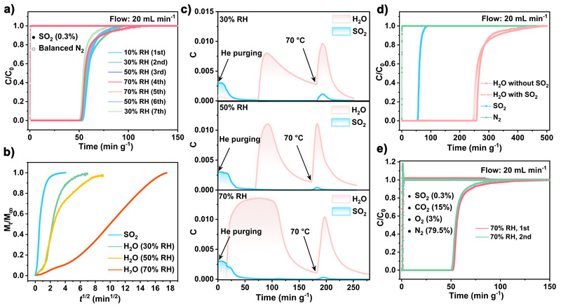 令人意外的是,该材料的SO2脱除性能几乎不受湿度变化的影响,在低湿度到高湿度(10%-70% RH)的循环穿透测试中表现出极佳的稳定性和不变的SO2穿透时间以及动态吸附量。反之,水气的穿透时间和吸附量亦不受低浓度SO2的影响。原位脱附实验表明,SO2与水气在混合烟气穿透过程中同时被选择性吸附,且水气吸附量与单组分动力学吸附曲线一致。因此,该MOF具有罕见的“SO2-水气”非竞争性共吸附行为。