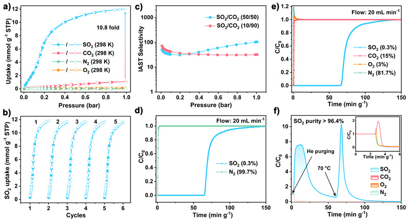 在298 K和1 bar条件下,该MOF的SO2饱和吸附量为12.1 mmol g-1,并对烟气中其他气体组分(主要为N2、O2和CO2)表现出高吸附容量比和选择性。动态穿透实验进一步证实NKU-201-Y可实现从干燥烟气中捕获微量SO2(3000 ppm),并能在相对温和条件(70 °C)下脱附回收高纯度SO2(> 96.4%),用于制备硫酸等精细化学品。
