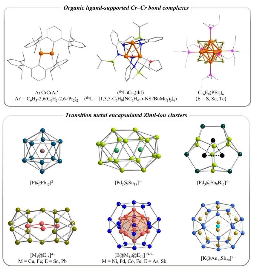 化学键是分子化学的核心,不仅决定了分子的结构和性质,还深刻影响其潜在的应用价值。自1964年首次合成具有Re‒Re多重键的配合物以来(Science 1964, 145, 1305-1307),过渡金属多重键凭借其独特的键合特征和复杂的电子结构,一直是化学研究的热点领域。其中,双核Cr2配合物的研究尤为引人注目,并展现出独特的键合模式和广泛的研究潜力。2005年,P. P. Power教授课题组报道了具有里程碑意义的Cr‒Cr五重键配合物Ar'CrCrAr' (Ar' = C6H3-2,6(C6H3-2,6-iPr2)2)(Science 2005, 310, 844-847),这一发现极大地激发了人们对Cr‒Cr多重键的广泛兴趣和深入研究(图1左上)。这类配合物通常由多样配位模式的有机配体支撑,研究的重点在于实现极短的Cr‒Cr键长和极高的键级(Nat. Chem. 2009, 1, 529-536)。此外,理论研究表明,裸Cr2二聚体的电子会自发形成闭壳层结构,这为构建小型Crn团簇提供了基础,且这些团簇展现出独特的电子结构和磁性特征。然而,随着原子数量增加,Crn团簇更倾向于形成稳定的多面体结构,而非平面构型,这使得平面Cr团簇的实验合成极具挑战性。与理论研究不同的是,Cr‒Cr键配合物的实验研究主要聚焦于双金属体系,而对Crn团簇的研究较少,仅限于三角形Cr3和八面体Cr6(图1右上),这限制了对该类化合物的探索以及对团簇中Cr‒Cr键合特性的深入理解。相比之下,主族Zintl离子团簇的研究进展显著,其中d区或f区金属原子能够嵌入由p区(半)金属原子构成的笼状结构(图1下)(Chem. Rev.2019, 119, 8506-8554; Chem. Soc. Rev.2022, 51, 628-649),为实验合成新型Cr团簇提供了理论和实验基础。因此,利用Zintl离子构建具有较大空腔的阴离子配体的策略,有望实现对小型甚至亚稳态平面Crn (n > 2) 团簇的有效封装。尽管目前针对这些化合物的研究工作仍在进行中,但能够设计并合成适用于捕获大型亚稳态铬簇物种的新型配体仍有待突破。