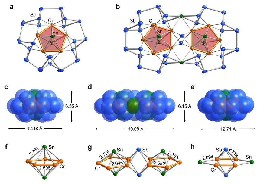 图1. 部分有机配体保护的Cr‒Cr化合物和过渡金属内嵌的Zintl离子团簇betway西汉姆联官网孙忠明教授团队长期致力于主族(金属)团簇的合成及成键机制研究(Acc. Chem. Res. 2021, 54, 1506−1516, 点击阅读详细)。通过高温固相合成与金属有机合成相结合的跨相合成策略,该团队在主族阴离子团簇中实现了一系列独特金属-金属键的构筑,如无机富勒烯团簇[K@Au12Sb20]5− (Science2023, 382, 840-843, 点击阅读详细)、开壳层球芳香性富勒烯团簇[K2(Bi@Pd12@Bi20)]4− (J. Am. Chem. Soc. 2024, 146, 14166-14173, 点击阅读详细)、三维高核配位中心的三明治团簇[Pn@M12Pn10(Pn5)2]4–/5– (Pn = As, Sb; M = Co, Fe) (Nat. Synth. 2023, 2, 423-429, 点击阅读详细),以及二元Fe/As团簇[Fe3(As3)3(As4)]3− (Angew. Chem. Int. Ed.2023, 62, e202217316, 点击阅读详细)。这些研究显著丰富了过渡金属-金属键团簇的种类,为新型Cr团簇的设计与合成提供了重要的研究基础,同时为Cr‒Cr键的成键特性及稳定性研究奠定了坚实的理论和实验基础。在前期研究工作的基础上,该课题组通过上述提到的Zintl离子跨相合成方法,成功在二元主族分子笼中捕获了平面型Cr5团簇,这在实验上首次证实了环状Cr5平面的存在。单晶X-射线衍射结果表明,平面Cr5阵列位于五角双锥的Cr5Sn2核心中,周围被纯Sb或混合Sn/Sb元素的分子腔包围,分别形成相应单体[Cr5Sn2Sb20]4−和融合生长的二聚体[(Cr5)2Sn6Sb30]6−(图2)。平面型Cr5团簇的成功捕获归因于团簇中芳香性五角双锥Cr5Sn2核心的形成,这可能是提高Cr5平面相对稳定性的关键因素。这些发现为铬化学研究开辟了新的方向,并推动了对Cr‒Cr和Cr‒主族金属键合机制的进一步理解。有趣的是,在团簇的生长和融合过程中,团簇的范德华尺寸发生了显著变化。在水平方向,团簇的尺寸从约12.18 Å扩大至约19.08 Å,而在垂直方向,尺寸则从约6.55 Å压缩至约6.15 Å(图 2c-e)。