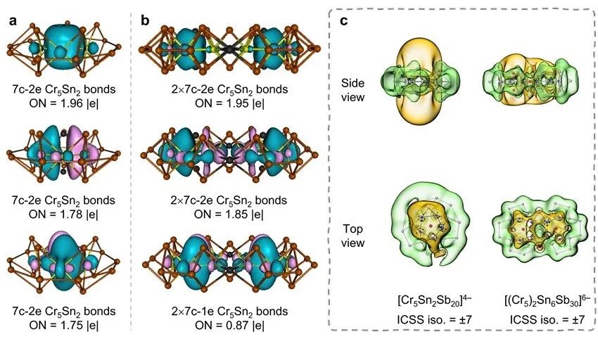 图2. 三元团簇[Cr5Sn2Sb20]4−和[(Cr5)2Sn6Sb30]6−的结构图。图片来源:Nat. Synth.理论计算深入研究了[Cr5Sn2Sb20]4−和[(Cr5)2Sn6Sb30]6−的成键与相互作用机制。适应性自然密度划分(AdNDP)分析显示,[Cr5Sn2Sb20]4−的Cr5Sn2核心中包含3个7c-2e σ键,共离域6个电子,符合Hückel规则(4n+2,n = 1),揭示了其σ-芳香性特征(图3a)。相比之下,[(Cr5)2Sn6Sb30]6−中每个Cr5Sn2单元也离域6个电子,同样满足芳香性判据(图3b)。为了进一步评估团簇[Cr5Sn2Sb20]4−和[(Cr5)2Sn6Sb30]6−中Cr5Sn2核心的芳香性特征,分别计算了垂直于Cr5平面施加场时的核独立化学位移(NICSzz)。结果显示,在这两个新型团簇中,Cr5Sn2核心的中心NICSzz值分别为-8.96和-30.97ppm。这表明,在二聚体结构中,两个融合单元的作用使得屏蔽区域得以延伸并增强,从而提升了整体的芳香性。此外,等化学屏蔽表面(ICSSs)分析进一步验证了[Cr5Sn2Sb20]4−和[(Cr5)2Sn6Sb30]6−的整体芳香性,结果表明芳香性主要来源于Cr5Sn2核心,并扩展至整个团簇结构,从而显著增强了团簇的稳定性(图3c)。