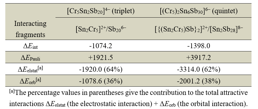 图3. 团簇[Cr5Sn2Sb20]4−和[(Cr5)2Sn6Sb30]6−的AdNDP和ICSSs分析。图片来源:Nat. Synth.为了阐明[Cr5Sn2]核心与周围纯Sb或混合Sn/Sb原子组成的分子空腔之间的键合作用,对[Cr5Sn2Sb20]4−和[(Cr5)2Sn6Sb30]6−进行了能量分解分析(EDA)。计算结果表明,这两种团簇的片段相互作用中静电相互作用占主导地位(表1),这在一定程度上反映了这些团簇在形成过程中的离子特性,并为其稳定性提供了重要支持。