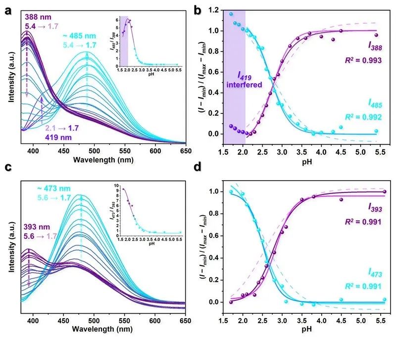 图2. NKM-808.50和NKM-809-BPDC的荧光发射光谱,及其发射强度基于HH型方程(实线;紫色/青色)、HH方程(虚线;品红/蓝色)和希尔方程(实线;品红/蓝色)的拟合。上述MOFs均具备远高于母体NKM-809的活化稳定性和酸稳定性,在酸性溶液中表现出高灵敏、显著和可量化的双波长荧光发射,且两个波段的发射强度基于酸度变化呈反比,可用于信号自校正。其中,NKM-809-BPDC通过引入辅助配体稳定结构弱点,防止PPTB配体的解离,从而避免了NKM-808.X系列中在高酸度条件下观察到的配体干扰发射。
