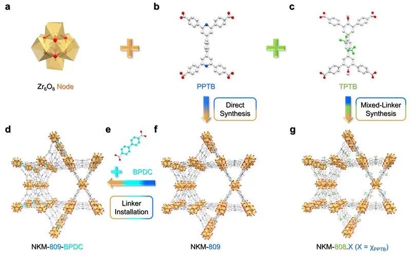 图1. NKM-809、NKM-808.X、NKM-809-BPDC的合成策略示意图。首先,该团队制备了第一例基于PPTB配体的锆基介孔MOF(NKM-809;此前报道的基于该配体的MOFs均为微孔MOFs),发现其活化后介孔孔道坍塌,导致源于其配体吡啶位点协同质子化的酸度传感性能较差,难以实际运用。通过合成过程中部分掺杂与PPTB同构的TPTB配体(曾用于合成介孔MOF——PCN-808),或在NKM-809的不饱和配位窗口中安装线性BPDC辅助配体,分别得到一系列NKM-808.X(X代表结构中PPTB配体的摩尔比例)和NKM-809-BPDC介孔MOFs。