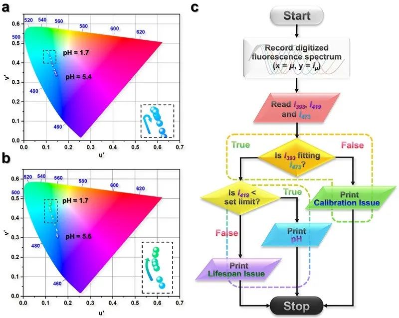 图3. NKM-808.50和NKM-809-BPDC的CIE1976色度图(插图:高酸度区间的CIE坐标变化)。(c) NKM-809-BPDC的工作逻辑理想流程图,集成了信号自校准(L形框)和质量监测功能(方形框)。而通过反向运用该特性,NKM-809-BPDC在一次自检中能够方便地集成信号自校正和产品寿命/缺陷自检测的功能。同时,这些稳定的介孔MOFs中的协同质子化/解离响应比之前研究的Zr-PPTB MOFs更强,这是由于其在空间上分布了更多相邻的吡啶氮原子和孔内增强的传质所致。通过混配体合成和合成后配体安装策略,将不稳定介孔NKM-809优化为稳定的NKM-808.X和NKM-809-BPDC,保留了有序的吡啶位点并表现出对酸度响应的双波长切换(390/485 nm)。此外,BPDC的安装有效地减少了PPTB的背景噪声,提高了传感的自校准的准确度并实现了额外的质量监测功能,成功挽救并拓展了NKM-809材料作为高效、自校准酸度传感材料的潜力。该工作证明并强调了细微的结构修饰也能显著提高MOFs的稳定性和性能,为先进功能材料的开发提供了独特的见解,并展示了介孔MOFs在传感应用中的创新性和可能性。